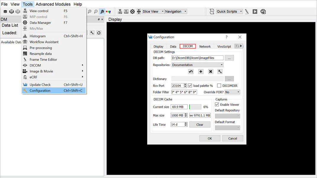 The second method is by selecting the Configuration option in the Tools menu, and then click on the DICOM panel.