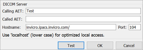 A DICOM server is specified by a calling AET, a Called AET, as well as a TCP address consisting of a host name and a port (the default settings are localhost:104). The AETs must be configured on the DICOM server. For VivoQuant, use port 23104 on the remote server.