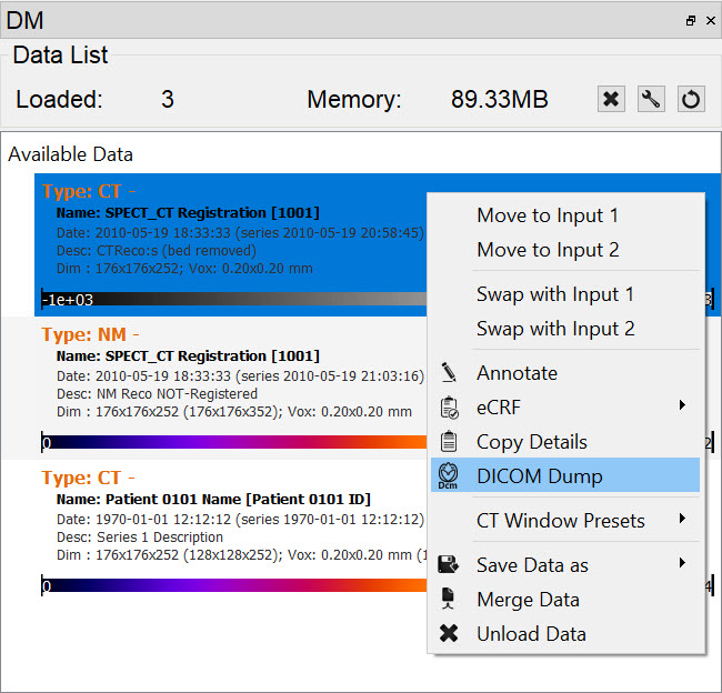 The fourth method is via the Data Manager. Right click on a dataset and click DICOM Dump.