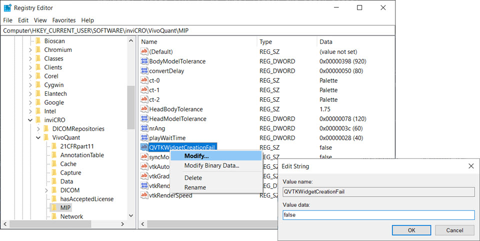 Computer\HKEY_CURRENT_USER\Software\inviCRO\VivoQuant\MIP. Check that theQVTKWidgetCreationFailis set tofalse.