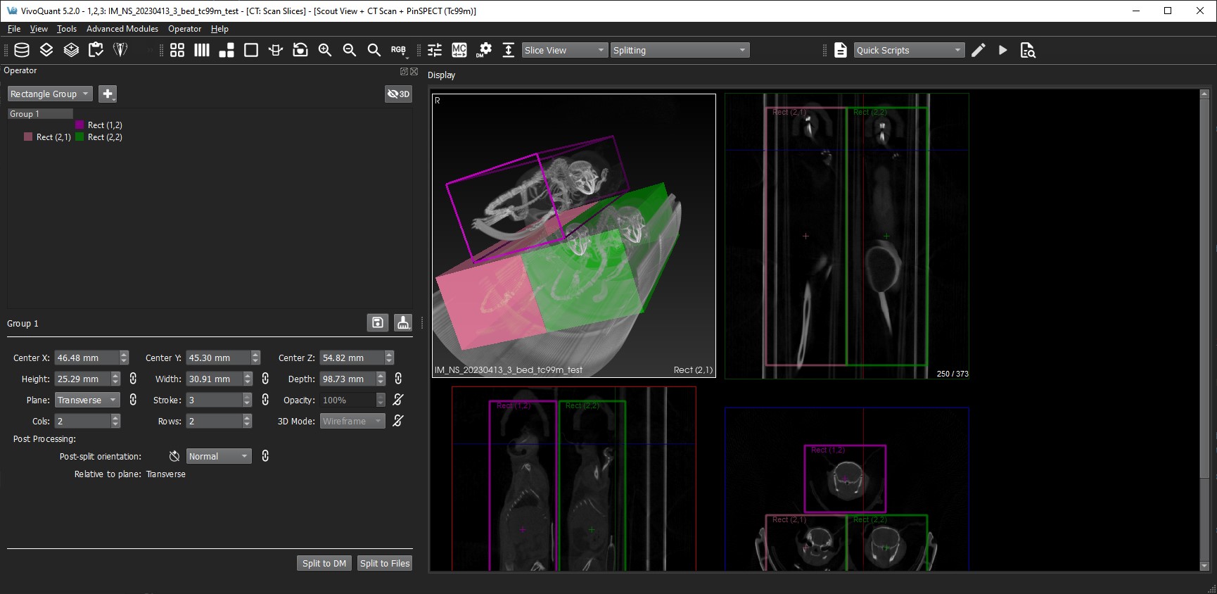 This operator allows the user to create and modify shapes to extract areas of interest. It is at its heart an elaborate cropping operator. The geometric properties of the shapes will ultimately decide the eventual splitting operation while the stylistic options are meant to help the user organize their workflow. Once fine tuning is complete the user can export the areas of interest into new data sources. The exported files can be automatically loaded into the data manager or saved out to the file system. There is also an additional option to control the orientation of the split data to aid in further analysis.