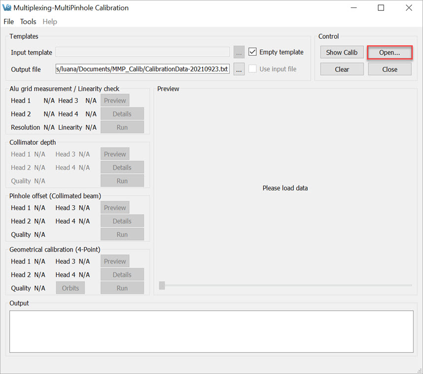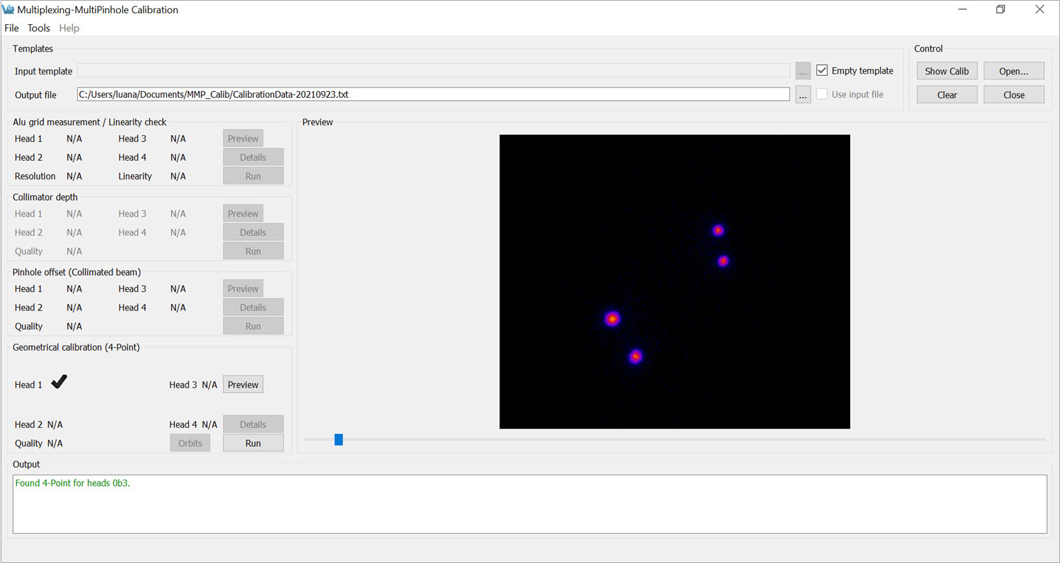 To run the tool, hit the Open button and select all of the relevant data (should be titled Service^SPECT_0*_CalibName and consist of 64 Intrinsic Resolution data sets, 4 Collimated Beam data sets, and 1 4-point data set) from the Data Browser. The MMP Tool reads in the calibration data and recognizes which data corresponds to which calibration. The panels for the individual calibrations display the completeness of the data. Once all necessary data is present, use the Run buttons in succession from the top calibration (Aluminum Grid) to the bottom calibration (Four-Point). Results for each calibration are presented in their respective panels; a description of possible errors is listed in Calibration Failures.