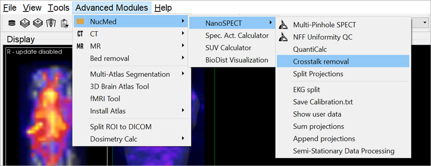 Access the Crosstalk Removal tool by going to Advanced Modules>NucMed>NanoSPECT.