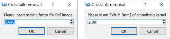 The Crosstalk Removal tool requires you to enter the scaling factor of both the Input and Reference images, as well as the Full-Width Half-Maximum (FWHM) of the smoothing kernel in order to remove crosstalk photons.