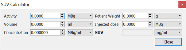The SUV Calculator requires several values to make its calculations. An activity and volume are used to calculate an activity concentration. The subject weight and injected dose are used in conjunction with the activity concentration to calculate the SUV. Units for these entries are user-selectable.