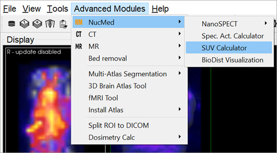 Access the SUV Calculator by going to Advanced Modules > NucMed > SUV Calculator.