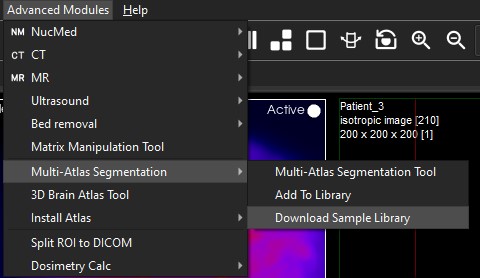 You can access the Multi-Atlas Segmentation Tool by navigating to Advanced Modules -> Multi-Atlas Segmentation. Here, there are three options: Multi-Atlas Segmentation, Add to Library, and Download Sample Library.