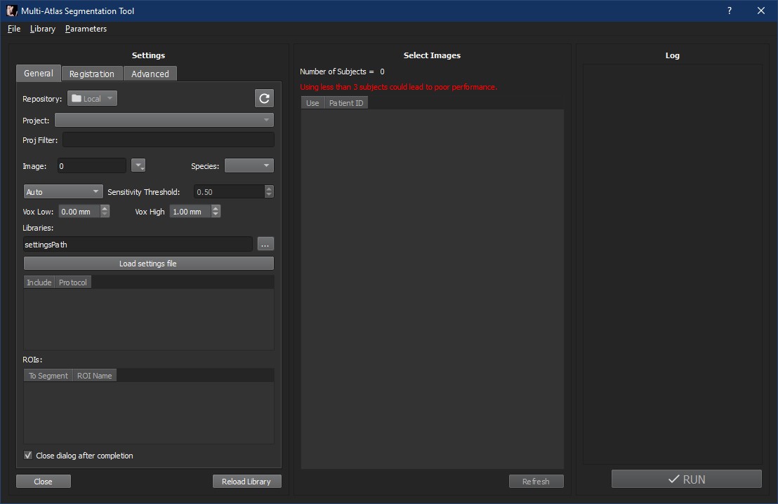 The Multi-Atlas Segmentation Tool generates ROIs by registering a series of images in a Reference Library to the image that has been loaded in the Data Manager. The Reference Images must each have a corresponding ROI. The tool registers the images in the Reference Library to the loaded data, and applies the same transformation to the corresponding ROI. The tool then works on a voxel-by-voxel basis, classifying a voxel to the new ROI if a greater percentage of the reference sets classified that voxel as within the ROI than the threshold percentage set by the user. Important factors that influence performance include image contrast, animal positioning consistency, and the size of the reference library.