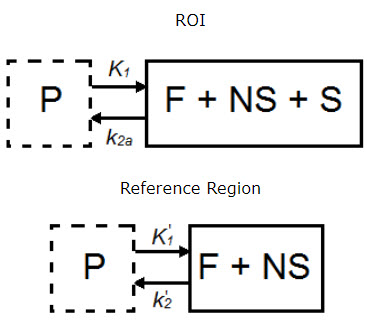 The simplified reference tissue model (SRTM) [1] allows for quantification of tracer kinetics without requiring an arterial input function. SRTM is a numerically robust model which assumes that the tracer can be represented by 1-tissue compartment models in both the ROIs and the reference region.