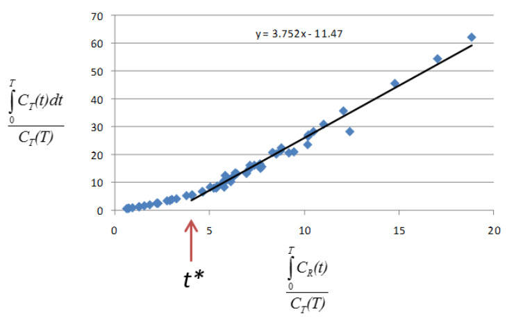 Patlak analysis is rearrangement of tracer kinetic equations to yield a useful linear equation [1]. Patlak analysis proposes that after some time t*, the plot of
