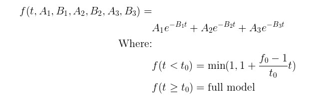 Users may want to smooth the fraction points with a sum of exponentials. Up to 3 exponentials can be used to fit the curve. If less exponentials are desired, users can fix model parameters for one or more of the exponentials (i.e. fix A3=0 and B3=0) [2]. To do so, use the Run button to estimate model parameters under the input conditions provided by the user.