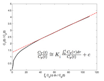 where CT is the concentration of the tracer in the tissue and CP is the concentration of the tracer in the metabolite-corrected arterial plasma, becomes linear with slope equal to the net influx rate constant, Ki. The rate constant Ki represents influx and trapping of the tracer into the tissue [1,2].