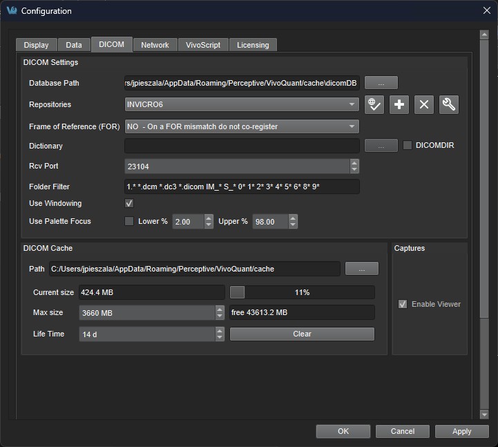 The DICOM panel in the Configuration dialog box provides the most in-depth DICOM information available in VivoQuant. The DICOM panel consists of three sections: DICOM Settings, DICOM Cache, and Captures.