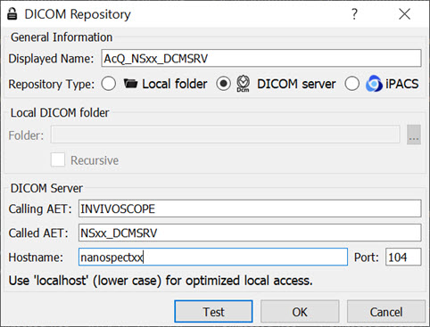 In place of hostname (i.e., nanospectxx), it is also possible to use IP addresses (i.e., 192.168.1.1 for local WS-ACQ computer connections). Please verify that the hostname resolves by using ping hostname in a Command window. Also, in order to access the ACQ computer from the WS computer, you must configure the DICOM Server on the ACQ computer.