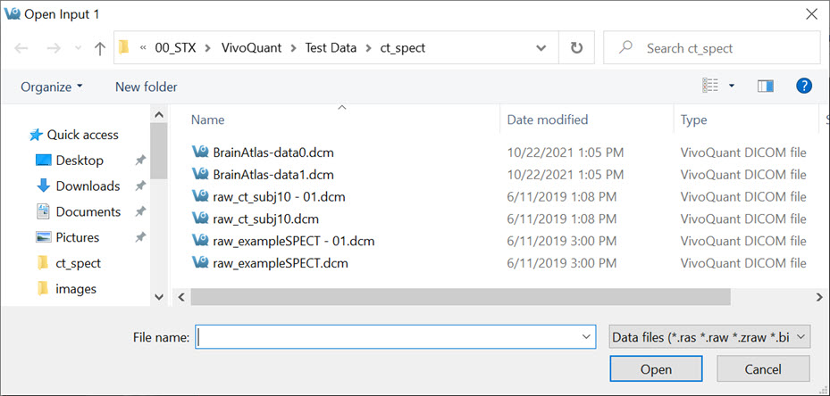 The second data set loaded into VivoQuant is called the Input data and refers to the SPECT data. When loading multiple data sets from the Data browser, VivoQuant recognizes SPECT/PET data and automatically sets it as the input file. For dual isotope imaging, two input data sets can be added simultaneously. VivoQuant is capable of handling several Supported File Formats