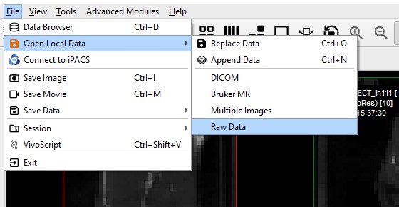Once the raw data has been selected, a Raw Data Importer window appears which contains information about the data, such as dimensions, voxel size, data type and file information. Most data is automatically populated from the file. Other data fields have to be filled in by the user in order to provide VivoQuant with information on how to interpret the file. Once all the data fields have been completed, click Load to import the raw data is imported.