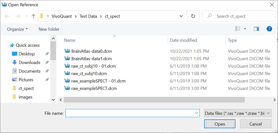 The first data set loaded into VivoQuant is called the Reference because it is often a CT image used for anatomical reference. When loading multiple data sets from the Data Browser, VivoQuant recognizes CT data and automatically sets it as the Reference. VQ is capable of handling several Supported File Formats.