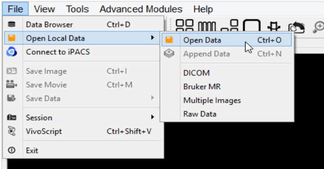 The third method is to use the keyboard shortcut Ctrl+O. For more on keyboard shortcuts in VivoQuant, please see Keyboard Shortcuts.
