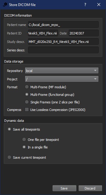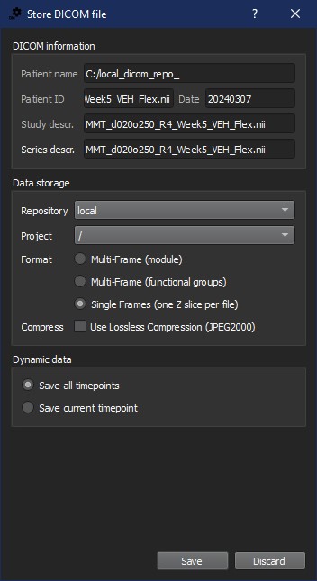 | DICOM | If the data is to be saved as a DICOM file, a Store DICOM file window is displayed. Any relevant information or description of the study can be entered into the DICOM information section of the window. Under the Data Storage section, the repository and the format of the saved DICOM files can be specified. The DICOM files are saved by clicking on Save or it can be canceled by clicking Discard. |