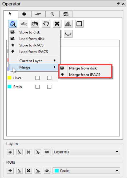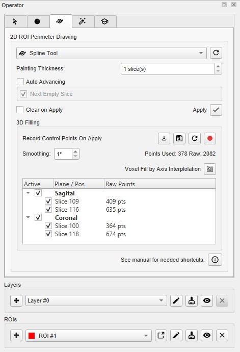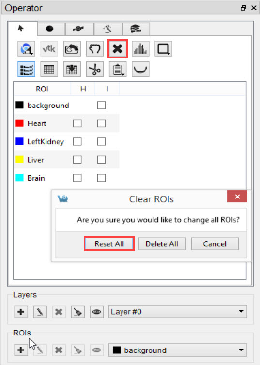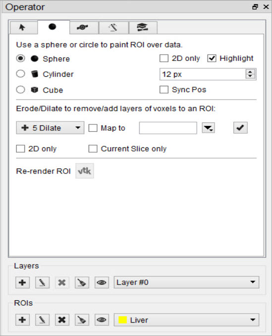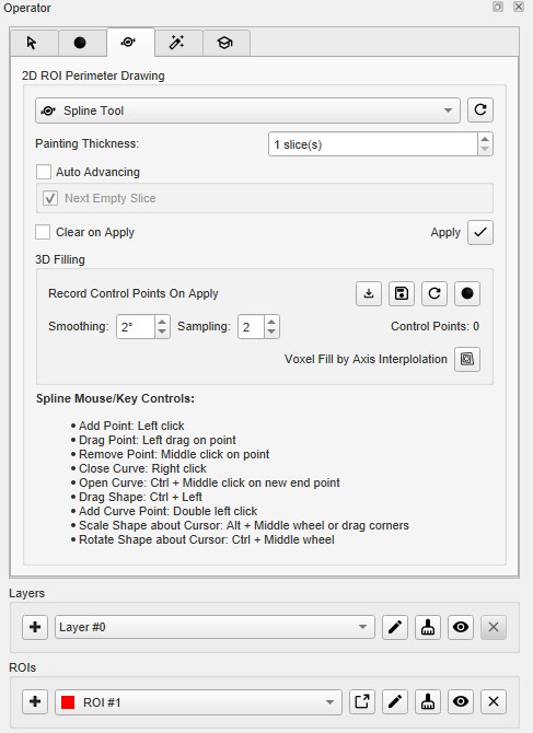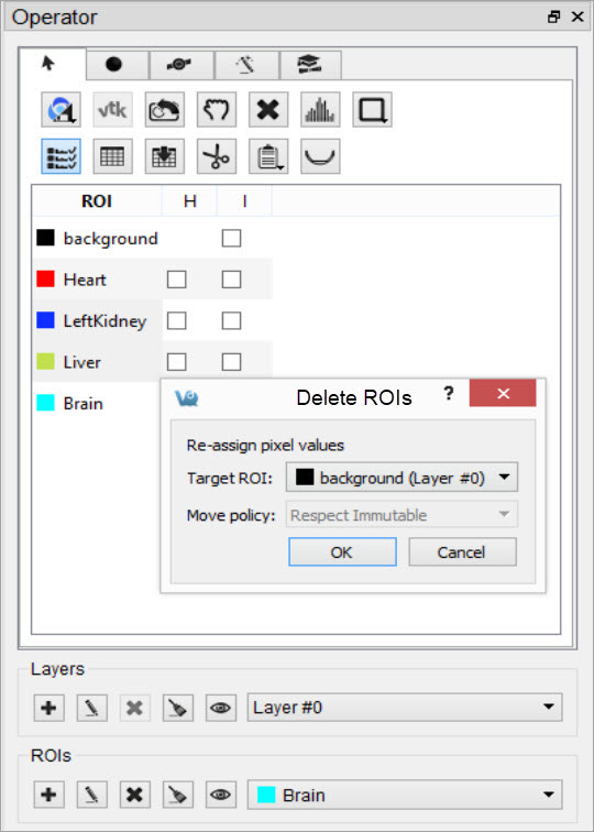 Layers can be created and deleted from the strip of icons at the bottom of the 3D ROI Operator.