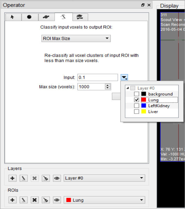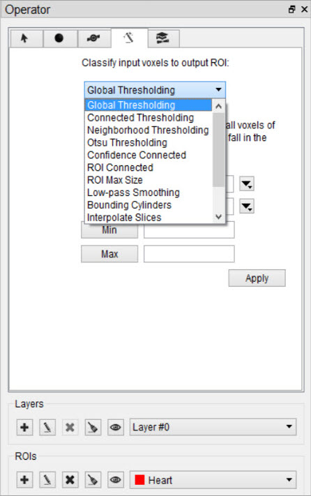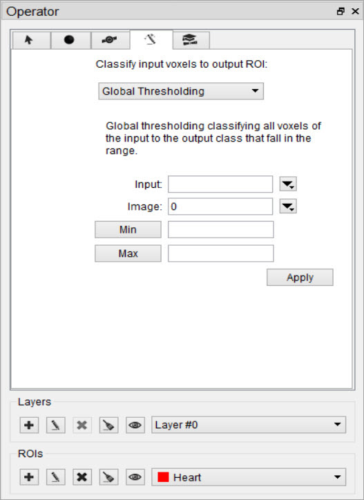 The Output ROI is the ROI specified in the ROI drop-down menu located at the bottom of the 3D ROI Operator window. If the Output ROI is not empty prior to thresholding, the result of the thresholding will be added to the existing voxels of the Output ROI.
