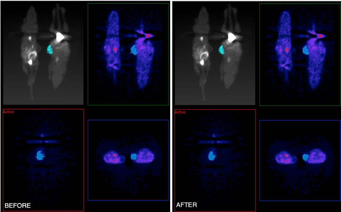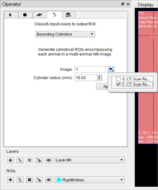 The Bounding Cylinders tool can be used to generate cylindrical ROIs that encompass each animal of a multi-animal image. The number of animals is automatically determined and the cylinder radius can be configured. This algorithm works best on NM images, but may also work on some CT images.