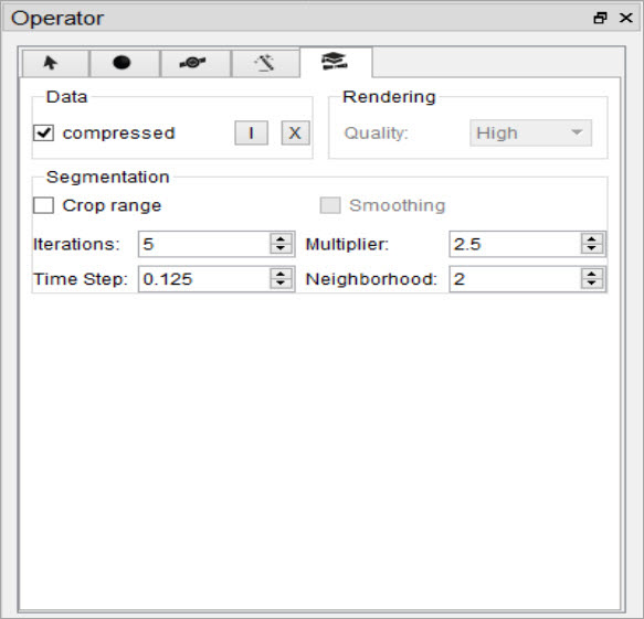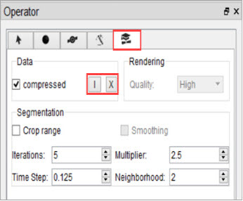 - When the desired thresholding method is performed (see Segmentation Tools to learn how to use the Segmentation panel of the 3D ROI Operator), only the region within the crop range will be segmented.