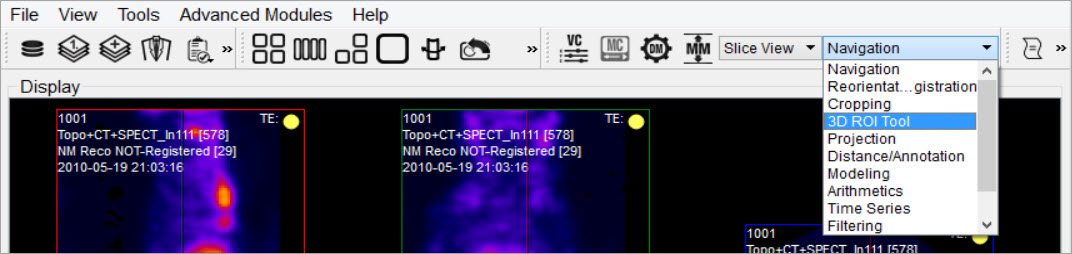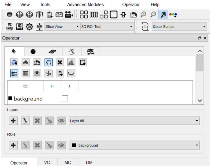 The first tab in the 3D ROI Operator window features tools for basic input/output operations, quantification, and viewing functionality. To freely navigate through the slices with the cursor, this panel must be active.
