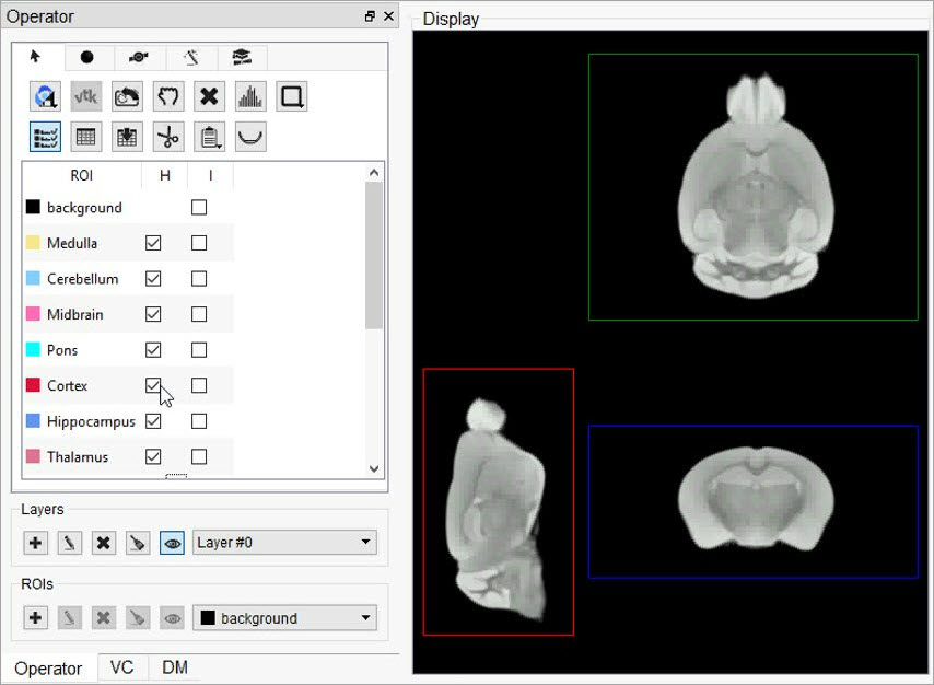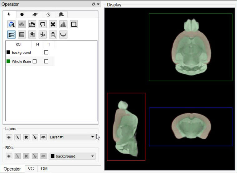 ROI stands for Region of Interest and is used to describe a particular area or volume within an image for which the user wishes to characterize some quantity or quality. The 3D ROI operator provides advanced tools for drawing, visualizing, saving, and quantifying both 2- and 3-dimensional regions. This operator allows for having a voxel belonging to more than one ROI. For example, a user could have an ROI that contains the whole brain and other ROIs for regions of the brain, meaning that each voxel of the whole brain ROI would need to simultaneously be part of two different ROIs.