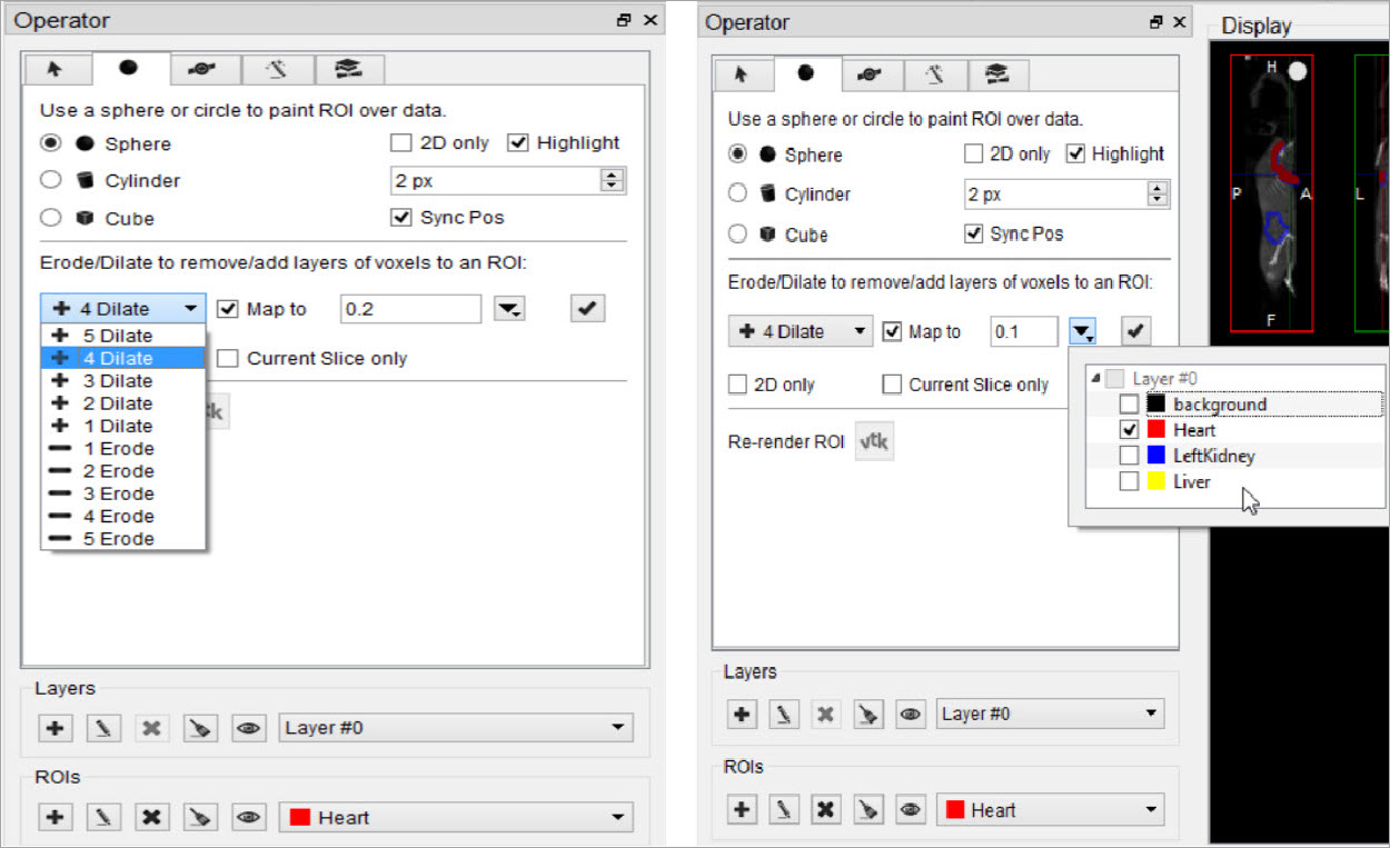 The Erode/Dilate tool allows users to modify the size of the input ROI by removing or adding up to 5 layers of voxels. Use Erode to shrink or contract the selected ROI, and Dilate to expand or enlarge it. These operations are applied to the currently selected ROI in the ROI selector.