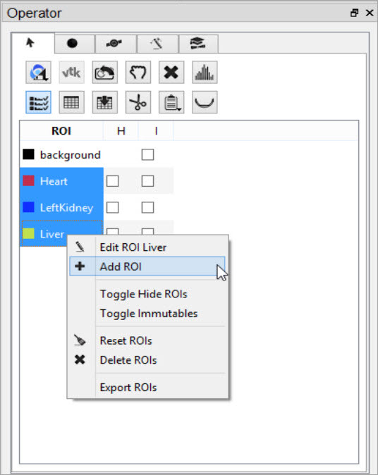 ROIs can be created and deleted from the strip of icons at the bottom of the 3D ROI Operator.
