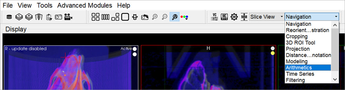 - Scalar operations: can be applied to any of the loaded images. The scalar value operation will be applied to each image voxel.