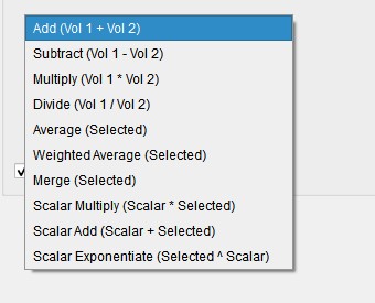 - Add, Subtract, Multiply, Divide, and Average: each of these operates on two images. These operations are performed voxel-wise.