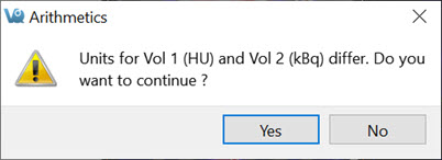Units are considered by the Arithmetics operator. A warning will be displayed if an attempt is made to add, subtract, multiply, divide or average two images of differing units and will allow the user to halt the operation.