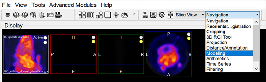 The Modeling operator can be accessed via the operator pull-down menu on VivoQuant’s front panel.