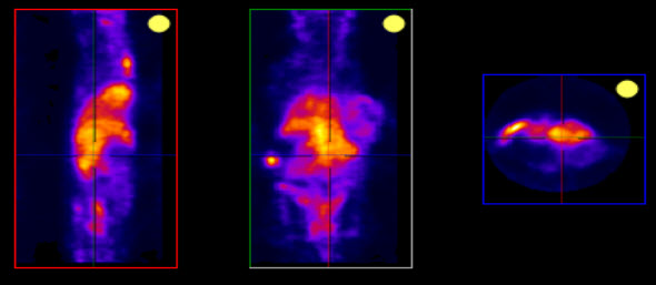 To scroll through the individual slices, left click and move the mouse cursor up and down or to the side on the different viewports (sagittal, coronal or transverse).