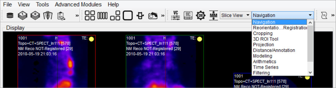 The Navigation operator is selected by default when VivoQuant is opened. This operator enables the user to manually scroll through the image slices and rotate the Maximum intensity Projection (MIP). Similar functionality is available via the View Control tool.