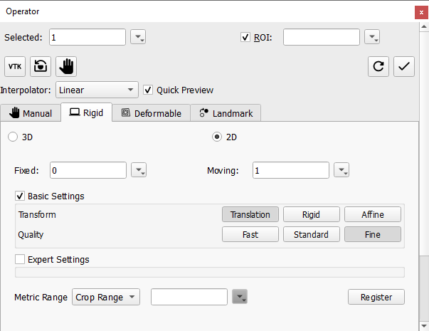 The Quick Preview option enables VivoQuant to render a low resolution version of the registration. Note: this toggle does not execute a registration but only allows a faster low resolution rendering after a registration as been computed via the Register button. Users can apply by clicking Apply in the Operator menu.