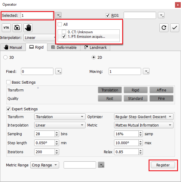 A crop range can also be defined which, when enabled, will perform the registration optimization calculations based solely on the voxels within the crop range. This can be useful when images have noise, regions of little to no signal, or other artifacts that may affect optimization calculations. For information about setting a crop range, see Crop Range under Expert Settings on the 3D ROI operator page.