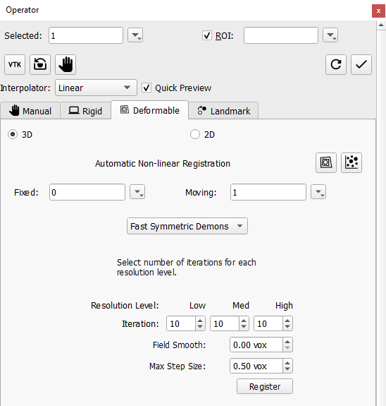 The 3D Automatic Non-Linear Registration tool provides deformable registration of the data by computing a unique transformation matrix for all voxels of data represented. After selecting your preference from the dropdown, the number of iterations for each resolution level can be adjusted. Drop-down preferences include: Fast Symmetrical Demons, Symmetric Demons, Diffeomorphic Demons, and Demons. To show the deformed grid overlaid or a heatmap of the Deformable vector field over of the image, use the toggle buttons.