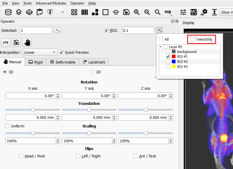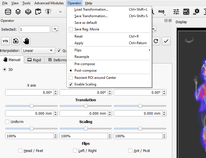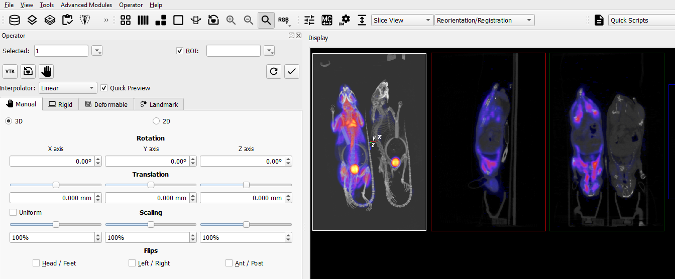 3D and 2D manual registration options are available in the first tab of the operator. Images/ROIs can be rotated up to 360 degrees around their X, Y and Z axis; translated in any direction along their X, Y and Z axis; and scaled in any dimension. The reorientation will be performed on all images/ROIs selected at the top of the operator window.