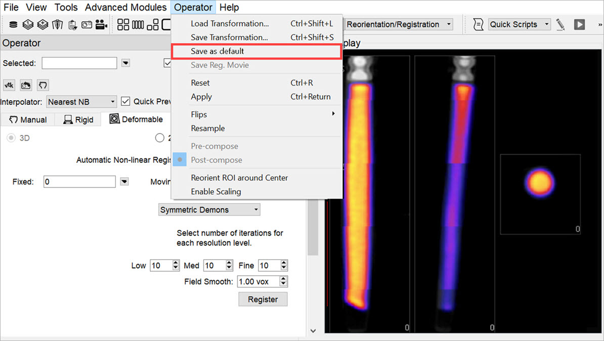 Use the reorientation tool to shift and/or rotate the image data set (Input 1) so that the image and CT data are perfectly aligned. Typically, only shifts are needed for this operation. If rotations are needed, they should be only plus/minus 1 degree. Before clicking Apply, go to Operator > Save As Default and save the transformation