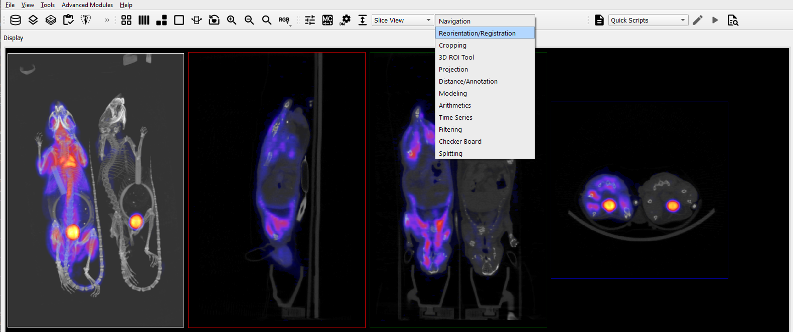 The Reorientation/Registration operator can be accessed via the operator pull-down menu on VivoQuant’s front panel.