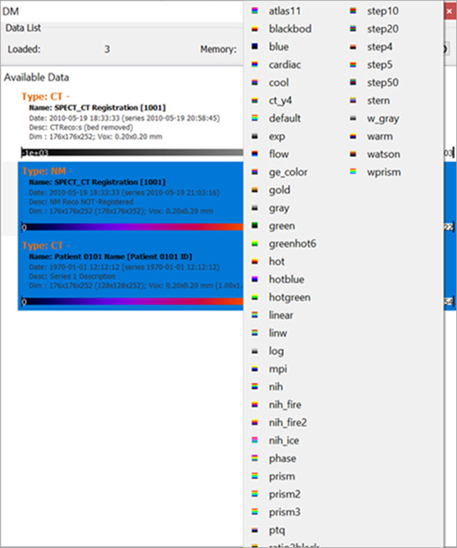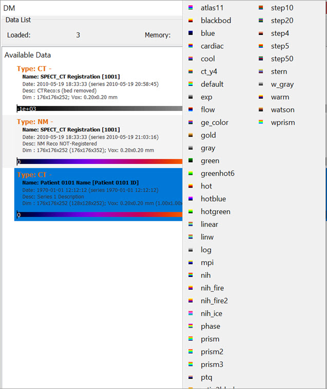 Below this information is a color bar specific to each dataset. The color bar defines the colors that will be used to represent the dataset in the Display. The colors can be changed by right-clicking the color bar and selecting the desired color palette. VivoQuant selects color palettes for datasets by default based on modality (CT, PT, MR, etc.). Default color palette options may be changed in the Display tab of the Configuration window. These changes do not affect the minimum and maximum values stored in the Min/Max Tool. For more information on changing the minimum and maximum values, see the Min/Max Tool page.