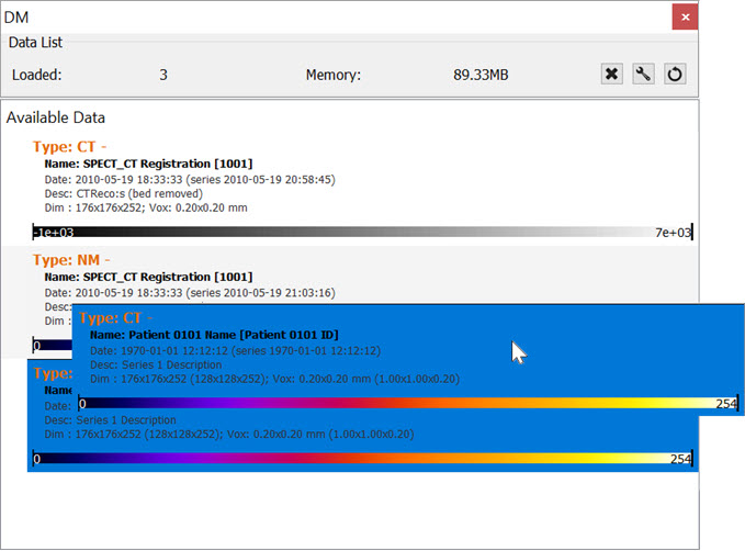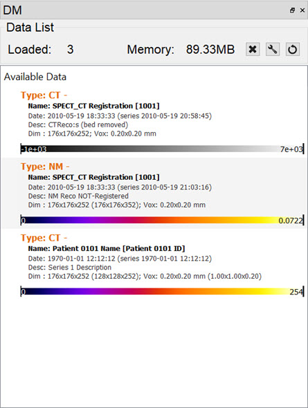 The information displayed by the Data Manager includes the image type, name, dimensions and voxel size. For DICOM data, the Study Date, Series Date, and Series Description will also be included when available. The information that is shown can also be customized with the Data Manager Text Configuration.