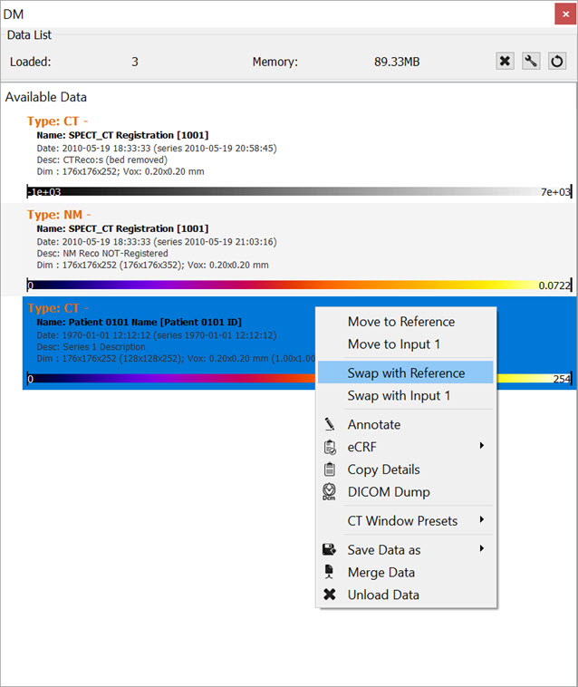 A dataset can also be quickly swapped with the dataset in the Reference, Input 1, or Input 2 positions by right-clicking on a dataset and selecting Swap with Reference /Input 1 /Input 2 .