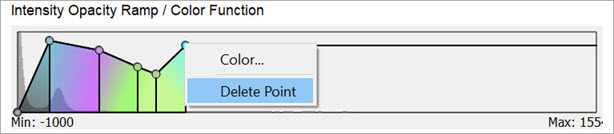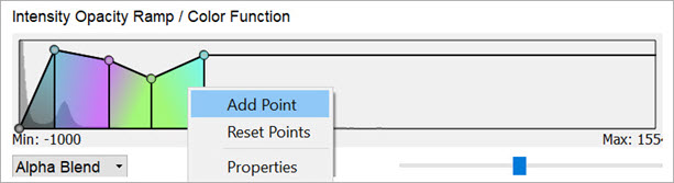 You can add a point to the transfer function in the histogram. To do so, right-click on the position you would like the new point to be added to within the histogram, and select Add new point. You can also reset the point to their original value by right-clicking the histogram and selecting Reset.