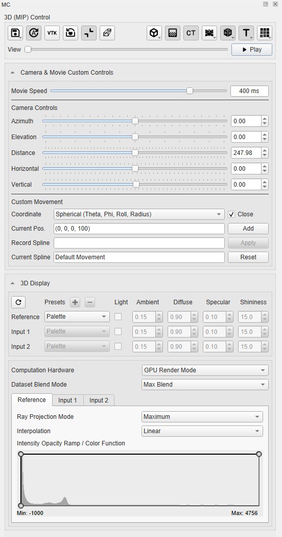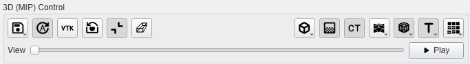 The MIP (Maximum Intensity Projection) control can be used to manipulate the active 3D rendered volume. See MIP Explained for a more detailed description of how the MIP is generated. This tool also allows the user to automatically rotate the 3D volume and create custom movements that can be exported as videos or gifs.