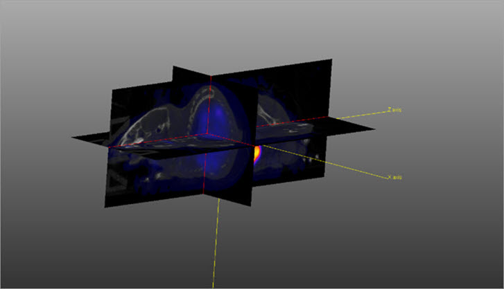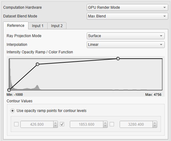 VivoQuant volume renderer allows for manipulating 3 data sets at the same time: Reference, Input 1 and Input 2. Users can select canned tissue presets, as well as creating and saving custom tissue properties, and editing existing tissue opacity and color functions.