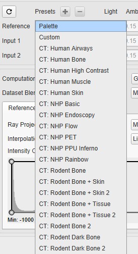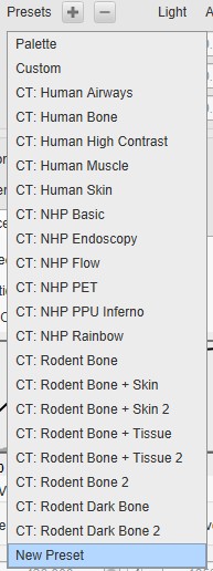 - CT Tissue Types and Species: These are presets that present CT property configurations that are specific to different tissue types and species. Some examples include: CT: Human Bone; CT: Human Muscle; CT: NHP Basics; CT: NHP PET; CT: Rodent Bone + Skin; CT: Rodent Dark Bone; among others.